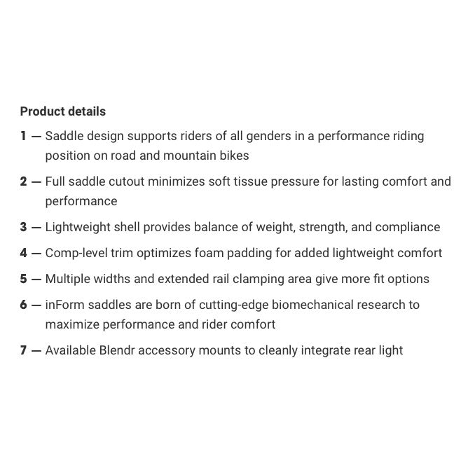 Our most versatile performance saddle puts you in a power posture for speed and control wherever you ride—and it’s available in an wide range of sizes to ensure you get the fit you need. A full cutout ensures long-haul comfort for all riders and all terrain. Plus, it has longer saddle rails to tailor your fit and an integrated Blendr mount for a Flare tail light.